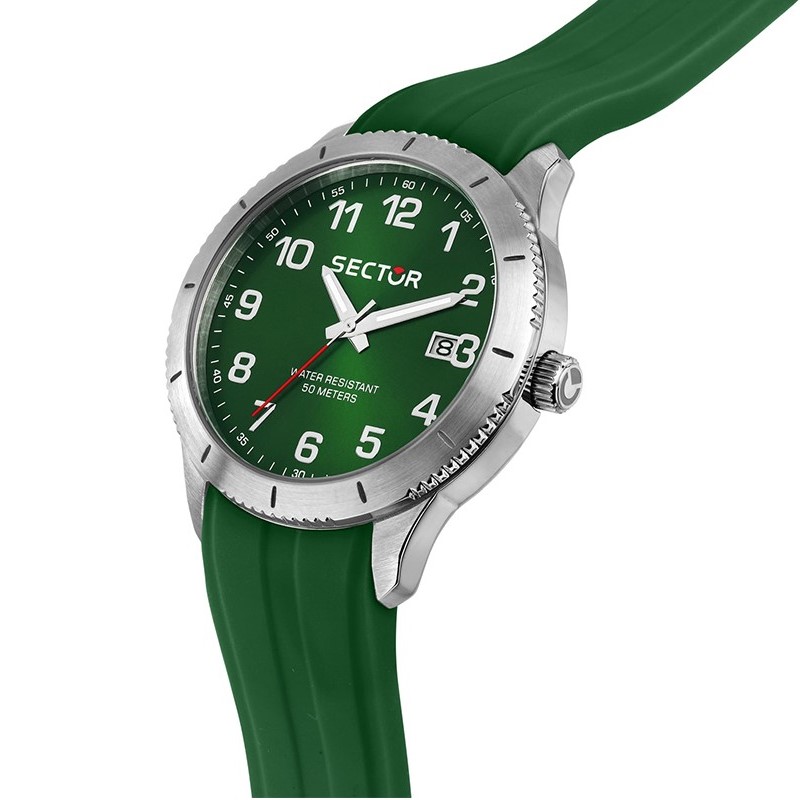 OROLOGIO SECTOR 270 - R3251578016 - Genere : Uomo / Unisex - Movimento: Solo Tempo - Colore Quadrante: Verde - Lancette luminose al buio - Materiale e finitura cassa: Acciaio lucido e satinato - Fondo cassa: Acciaio inox - Misura cassa: 37 mm - Spessore cassa: 9,70 - Vetro: Vetro minerale - Materiale cinturino: Silicone - Colore cinturino: Verde - Chiusura: Fibbia ardiglione - Movimento: Quarzo Giapponese - Water resistant: 5 atm