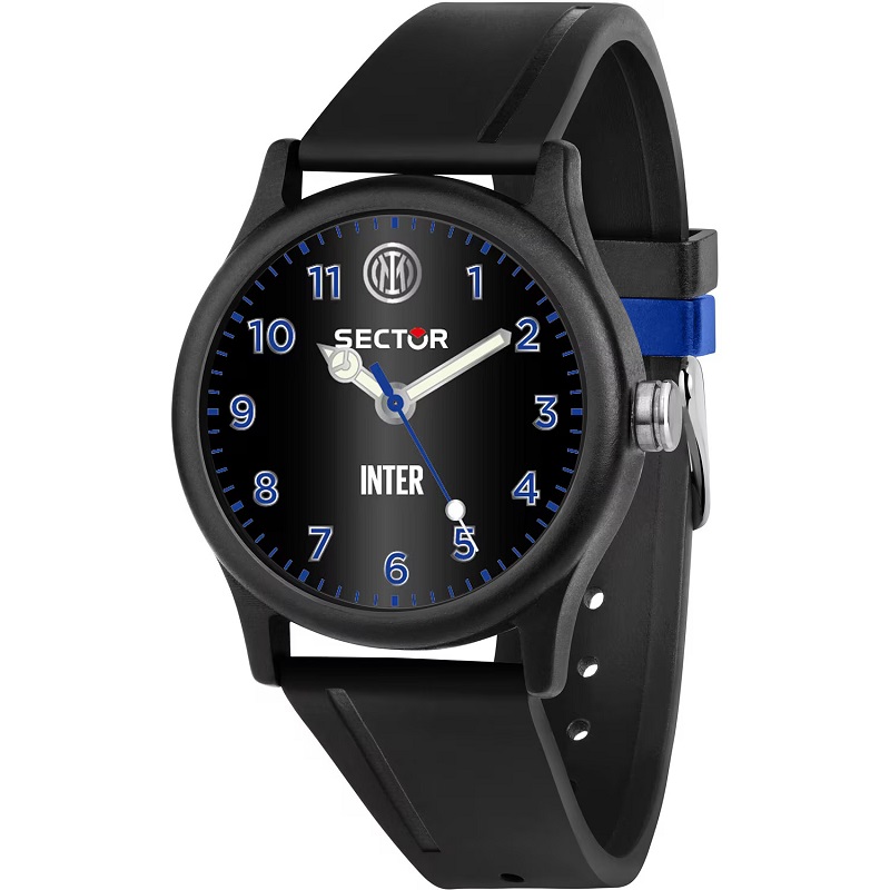 OROLOGIO SECTOR EX-Q - R3251203007 - Genere: Uomo / Unisex - Movimento: Solo Tempo a 3 Sfere - Colore Quadrante: Nero opaco, personalizzato con Loghi Sector / Inter e numeri blu - Lancette luminose al buio - Numeri e logo Inter (al 12) in metallo lucido - Materiale e finitura cassa: Policarbonato nero opaco - Fondo cassa: a 4 viti, in acciaio inox, personalizzato con doppio logo Sector / Inter - Misura cassa: 41 mm - Spessore cassa: 11,00 - Vetro: Acrilico - Materiale cinturino: Silicone - Colore cinturino: Nero - Chiusura: Fibbia ardiglione, in acciaio - Movimento: Quarzo Giapponese - Water resistant: 5 atm
