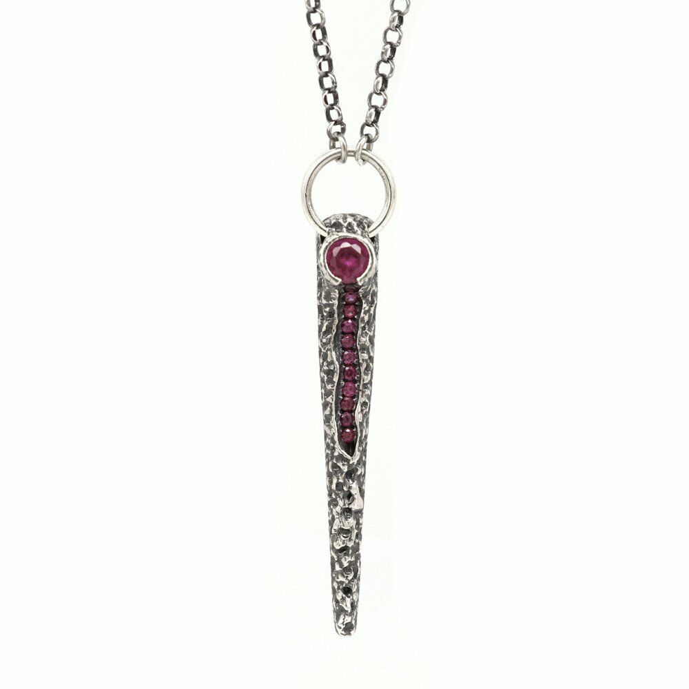La collana, realizzata in argento invecchiato e impreziosita da pietre fucsia, trae ispirazione dalle lingue di lava che scorrono tra i crateri dei vulcani.