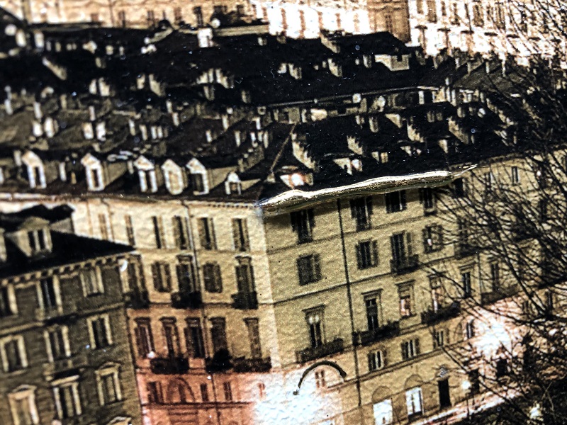 Pannello/Quadro in Legno, con dimensione 32 x 45 x 2 cm - Lavorazione fotografica su superficie pittorica (con pennellate "a rilievo", rifinito a mano dalle maestre della nostra Bottega d’Arte, con applicazione di dettagli in rilievo tridimensionale 3D in Argento lucido e dorato (vedi foto). Riproduzione artistica su superficie pittorica.