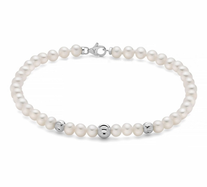 Marca YUKIKO - Bracciale / Braccialetto con filo perle Fl 0,43 Perle vere MR Col. Bianco, Diametro 4-4,5 mm - N.3 elementi lavorati a Boule, in Oro Bianco 18 kt 750/000 - Chiusura a Moschettone in Oro Bianco 18 kt 750/1000 - Lunghezza 17 cm + Chiusura - COD. Referenza: PBR3473Y