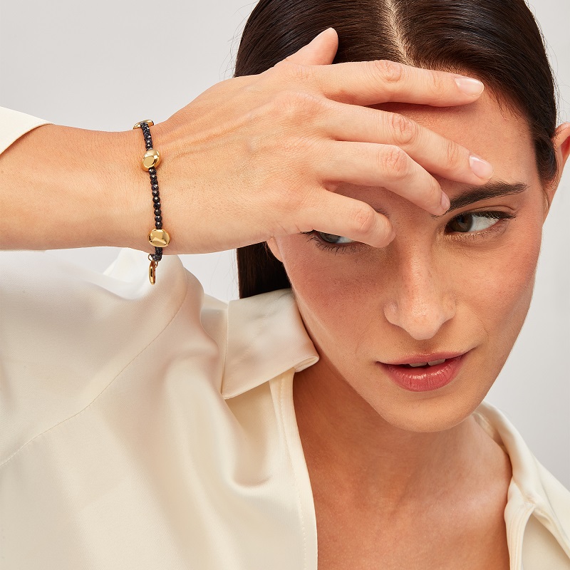 Il bracciale B Rocks combina una catena in sandstone blu con piccoli elementi tondeggianti in acciaio lucido color oro. Un accessorio delicato, ma dagli accostamenti audaci e dall'anima rock. La chiusura è regolabile.