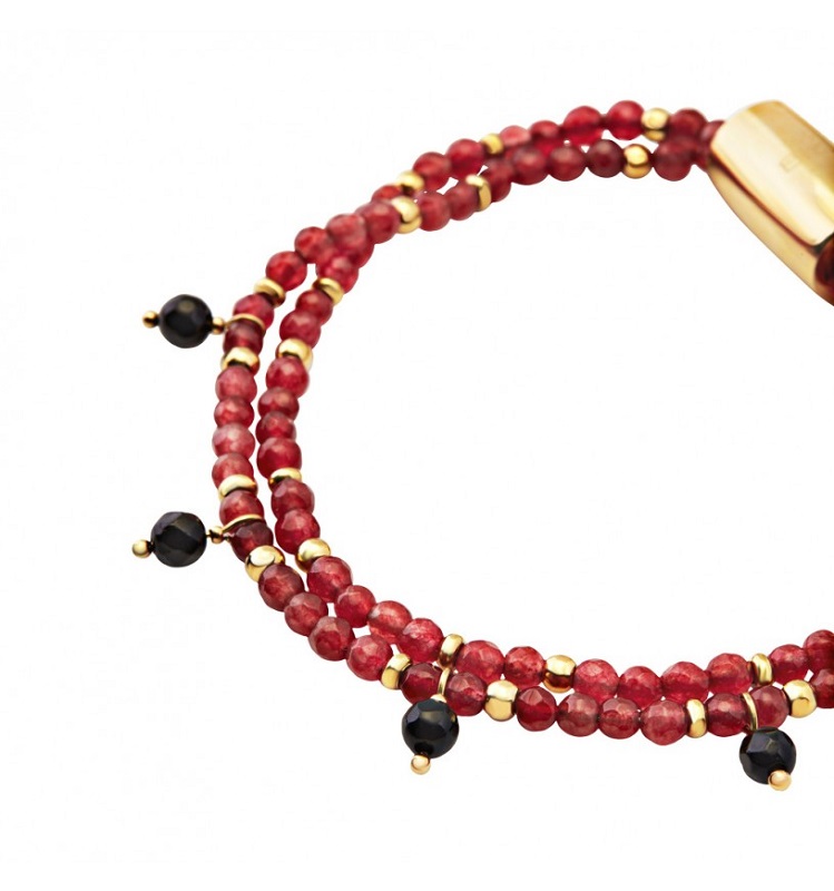 Magnetica System è la collezione di gioielli che, grazie ai suoi diversi elementi e alle chiusure magnetiche, può essere modificata e assumere forme e stili sempre diversi. Il bracciale Red Carpet è composto da due catene in agata rossa, arricchite da micro sfere in acciaio color oro e da 5 charms in agata nera. Può essere indossato da solo o abbinato ad ogni altro elemento della collezione, per creare nuove collane di diverse lunghezze.
