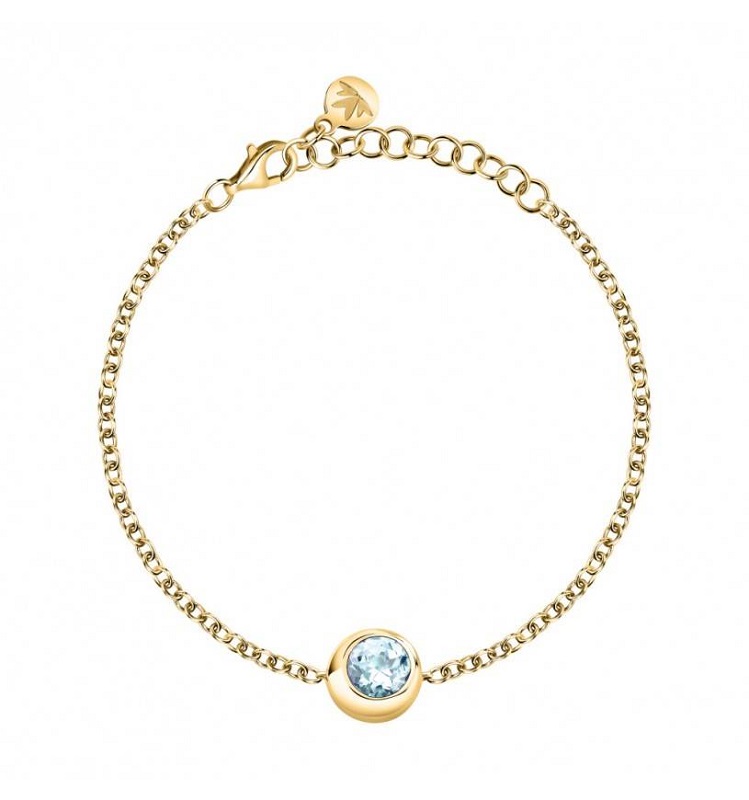 Bracciale da donna Morellato della collezione Tesori Eterni, codice prodotto SAXN11, realizzato in argento 925% riciclato con finitura dorata. Centrale con cristallo di topazio azzutto. Lunghezza totale di 19 cm, regolabile fino a 16 cm, con chiusura a moschettone.