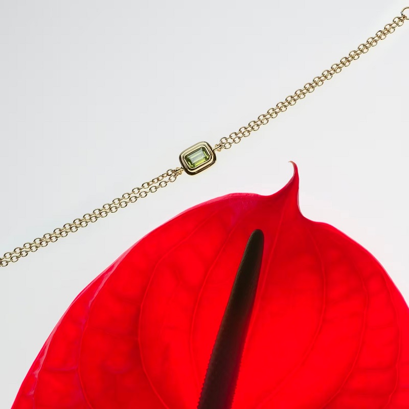 Genere: Donna - Lunghezza massima 19 cm, accorciabile - Colore: Oro giallo - Stile: Fashion - Modello: Catena a maglie, con Zircone Verde centrale (dimensione 4 x 6 mm) a taglio baguette - Materiale: Acciaio inox - Peso: 3,7 gr - Certificato di autenticità - Confezione: Originale Trussardi.