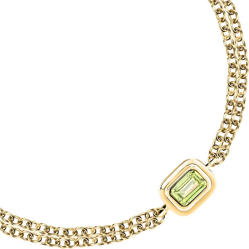 Genere: Donna - Lunghezza massima 19 cm, accorciabile - Colore: Oro giallo - Stile: Fashion - Modello: Catena a maglie, con Zircone Verde centrale (dimensione 4 x 6 mm) a taglio baguette - Materiale: Acciaio inox - Peso: 3,7 gr - Certificato di autenticità - Confezione: Originale Trussardi.