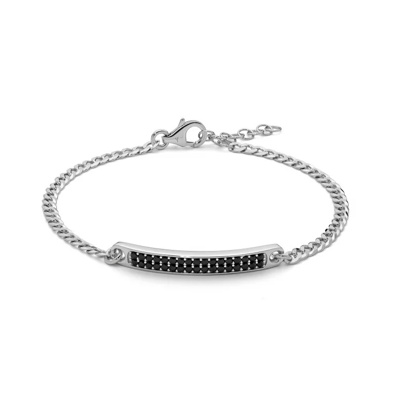 Bracciale da uomo Yukiko in argento 925, brunito antracite e piastra / piastrina di 3,5 cm, con doppia fila di Zirconi neri - Bracciale modello a piastrina (non incidibile), con catena stile groumette - La chiusura del bracciale è con moschettone personalizzato "Yukiko" - Lunghezza del bracciale è regolabile da 19 a 22 cm