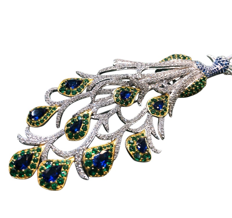 Stupendo Gioiello da indosso a forma di Pavone, caratterizzato da una dettagliata montatura in Argento 925, con particolari dorati sulle piume, ricco di Zirconi bianchi, verdi e blu; il tutto rende l'oggetto quasi vivo tridimensionale che rivela un'accurata lavorazione, il tutto corredato da una elegante catenina, modello fope, in Argento 925, lunga 58 cm che può esssere facilmente estratta in modo da utilizzare l'articolo come spilla. Un vero trionfo di dettagli esaltanti il mondo animale con tutto il suo fascino e maestosità.