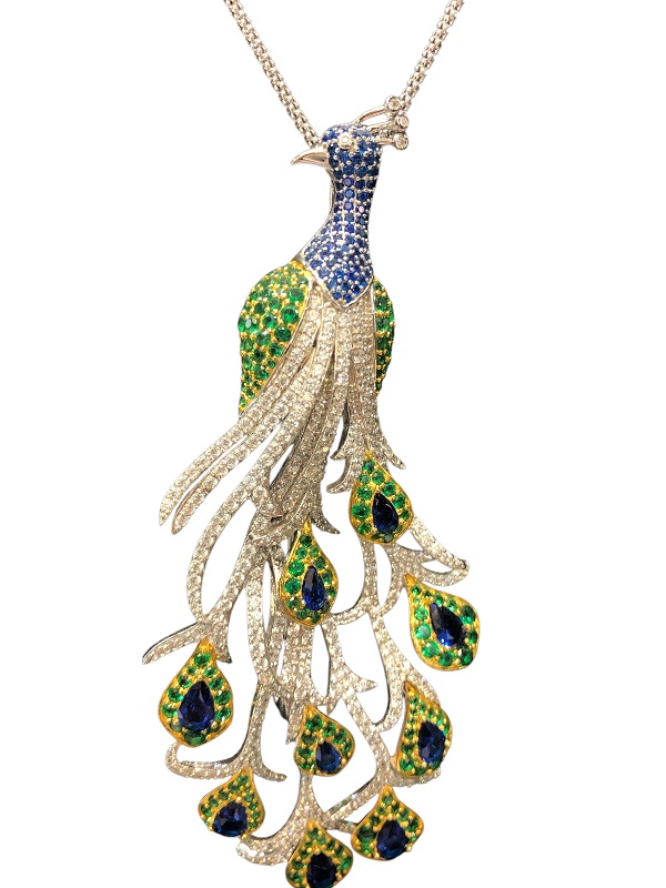 Magnifico Ciondolo-Spilla a forma di Pavone, realizzato da sapienti mani artigiane italiane