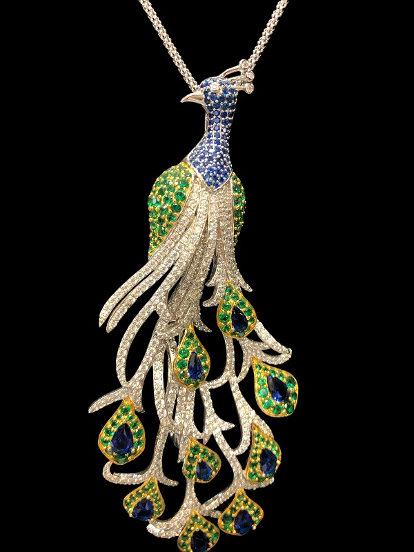 Magnifico Ciondolo-Spilla a forma di Pavone, realizzato da sapienti mani artigiane italiane