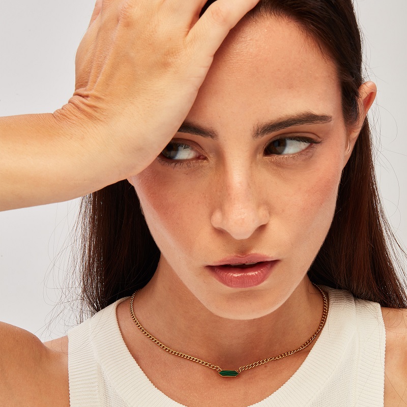 La collana Stylize presenta un’elegante catena groumette in acciaio color oro, arricchita da un elemento centrale a forma esagonale in malachite. Il contrasto tra il brillante acciaio dorato e il verde della pietra crea un effetto sofisticato e d’ispirazione Art Déco. Un gioiello versatile che aggiunge un tocco chic anche agli outfit più casual.