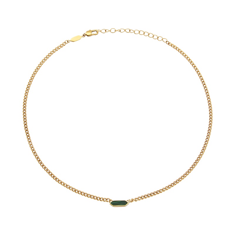 La collana Stylize presenta un’elegante catena groumette in acciaio color oro, arricchita da un elemento centrale a forma esagonale in malachite. Il contrasto tra il brillante acciaio dorato e il verde della pietra crea un effetto sofisticato e d’ispirazione Art Déco. Un gioiello versatile che aggiunge un tocco chic anche agli outfit più casual.