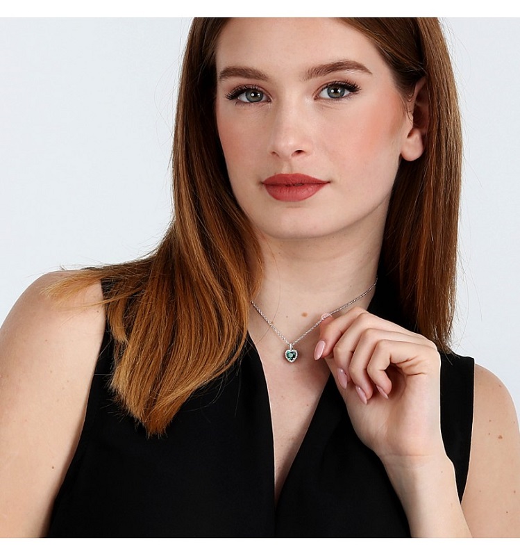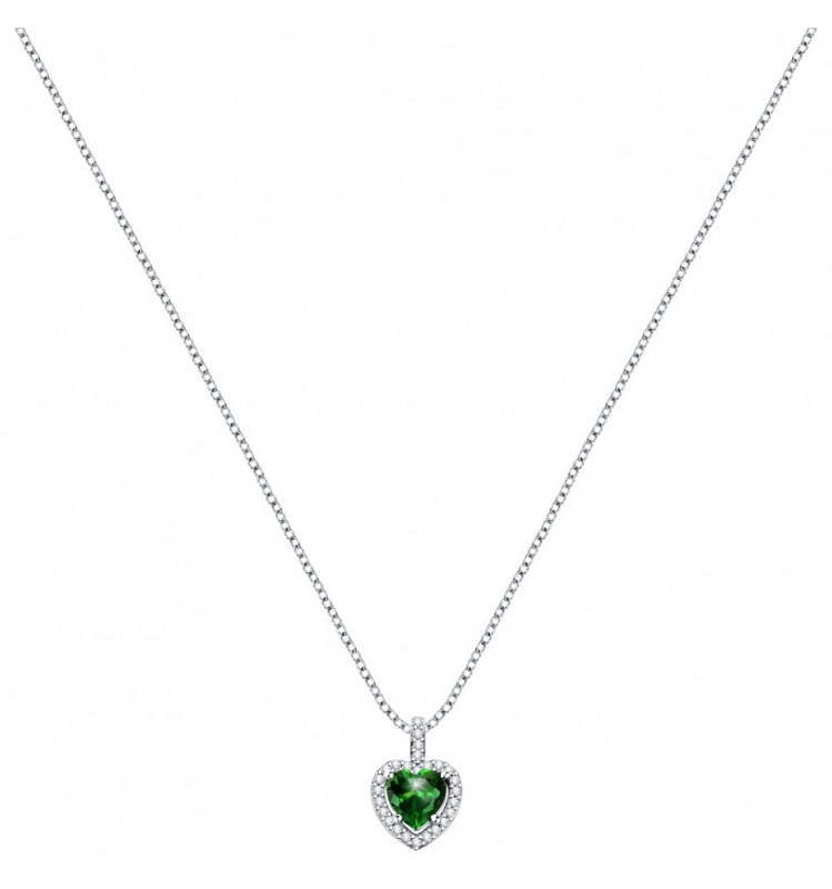 Collana da donna realizzata in argento 925% con finitura rodiata. Pendente a cuore con cristallo verde contornato da zirconi bianchi. Lunghezza: Minima 38 cm Massima 42 cm, Peso: 3g, chiusura a moschettone.
