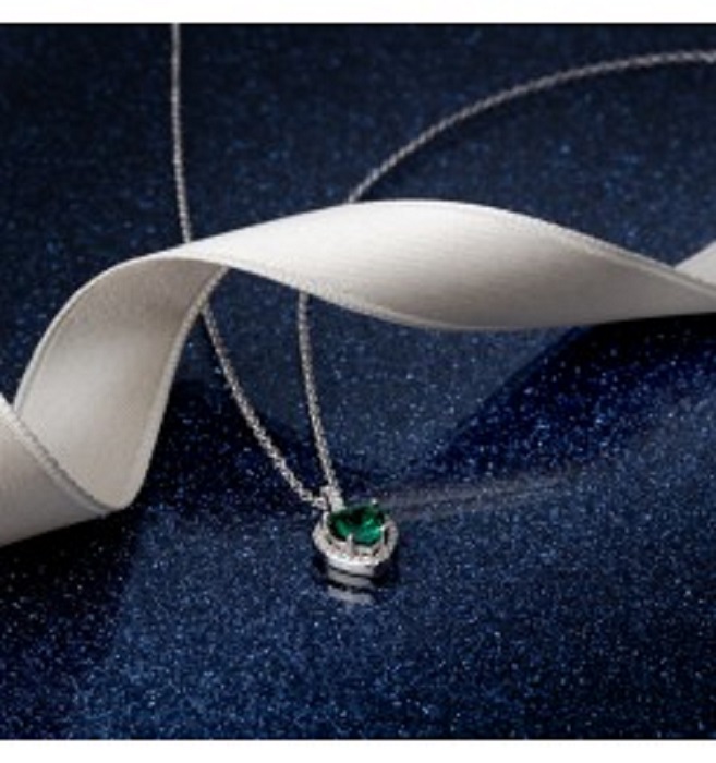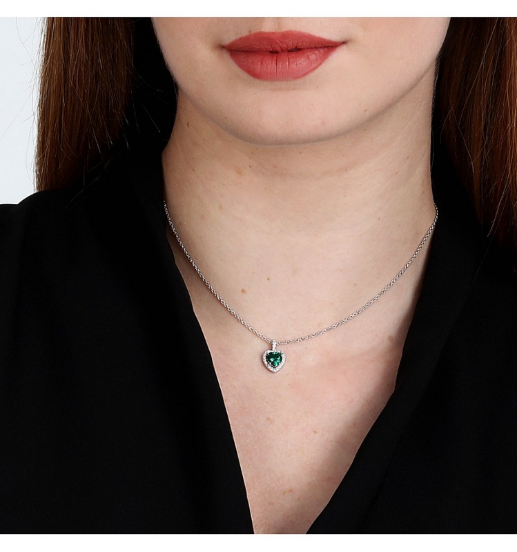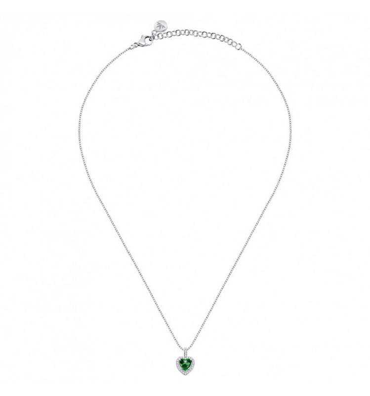 Collana da donna realizzata in argento 925% con finitura rodiata. Pendente a cuore con cristallo verde contornato da zirconi bianchi. Lunghezza: Minima 38 cm Massima 42 cm, Peso: 3g, chiusura a moschettone.