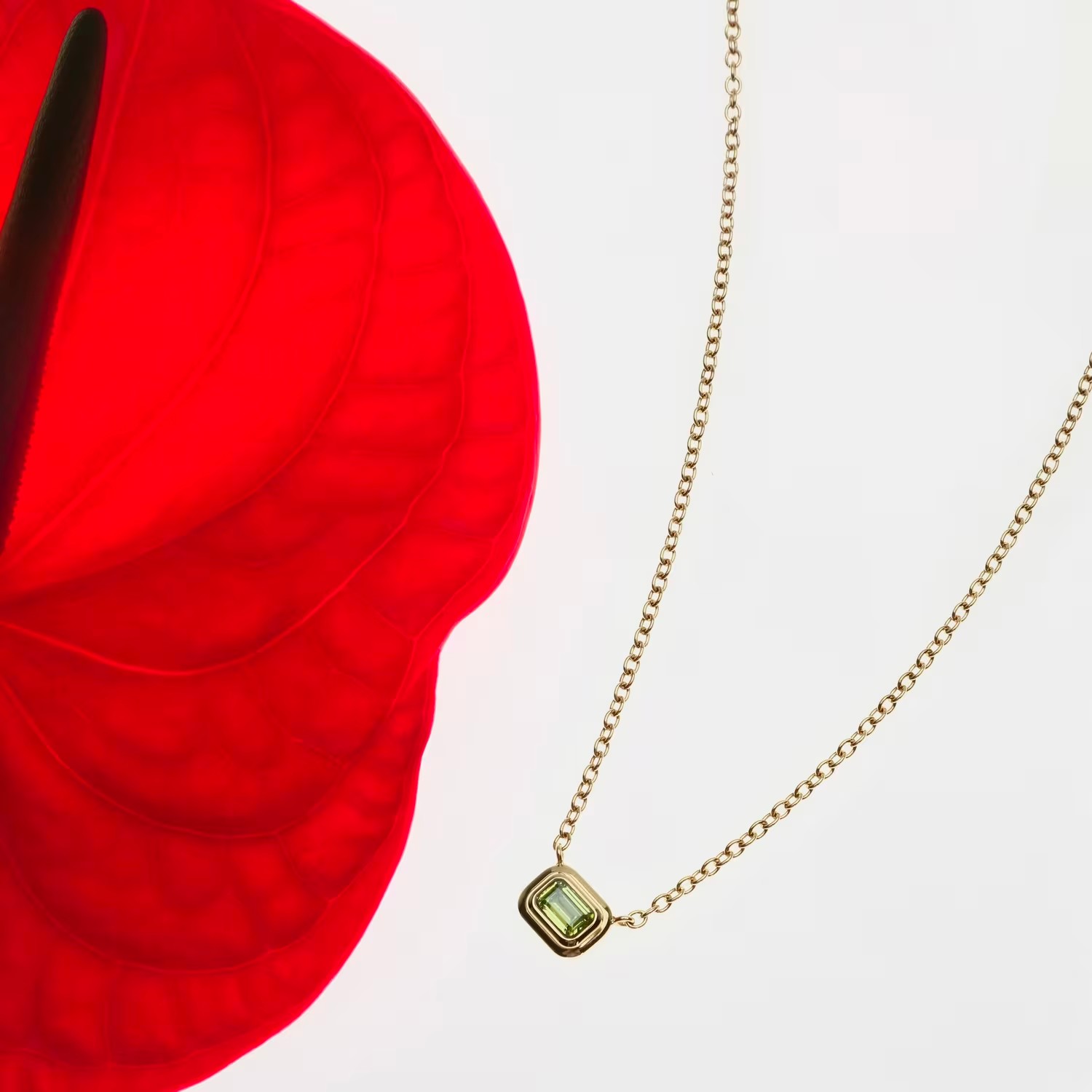 Genere: Donna - Lunghezza totale 45 cm, accorciabile - Colore: Oro Giallo - Stile: Fashion - Modello: Catenina con Ciondolo Zircone Verde centrale, a baguette, misura 4 x 6 mm - Materiale: Acciaio inox dorato - Peso: 4,6 gr - Certificato di autenticità - Confezione: Originale Trussardi.