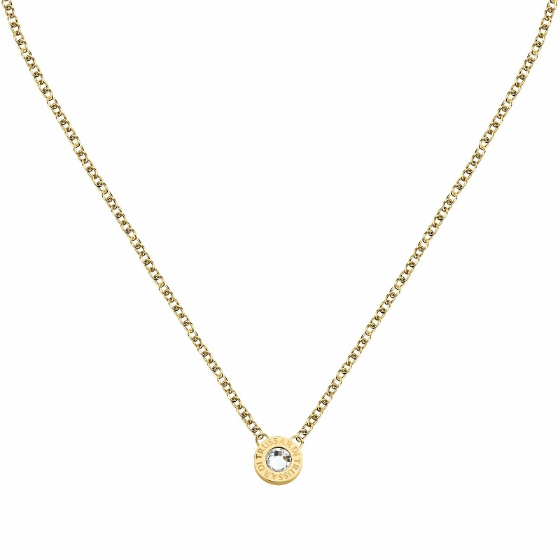 Genere: Donna - Lunghezza 40 + 5 cm - Colore: Oro Giallo - Stile: Fashion - Modello: Catenina con Ciondolo tondo liscio ∅ 5mm e Cristallo - Materiale: Acciaio inox dorato, Cristalli - Peso: 4,7 gr - Certificato di autenticità - Confezione: Originale Trussardi.