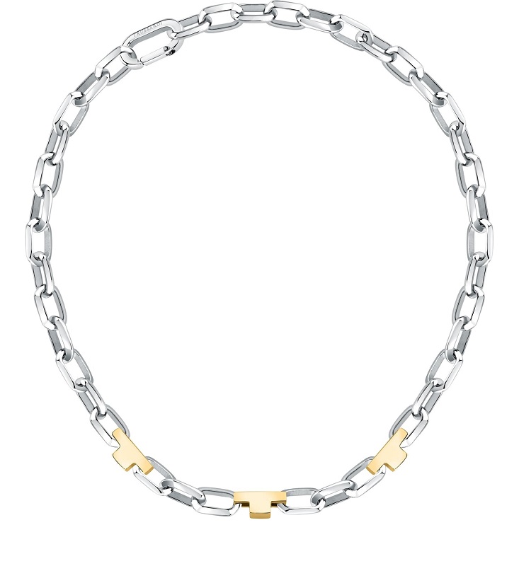 Genere: Donna - Lunghezza 45 cm - Colore: Silver, con dettagli a "T" dorati - Stile: Fashion - Modello: Catena a maglie - Materiale: Acciaio inox - Peso: 44 gr - Certificato di autenticità - Confezione: Originale Trussardi.