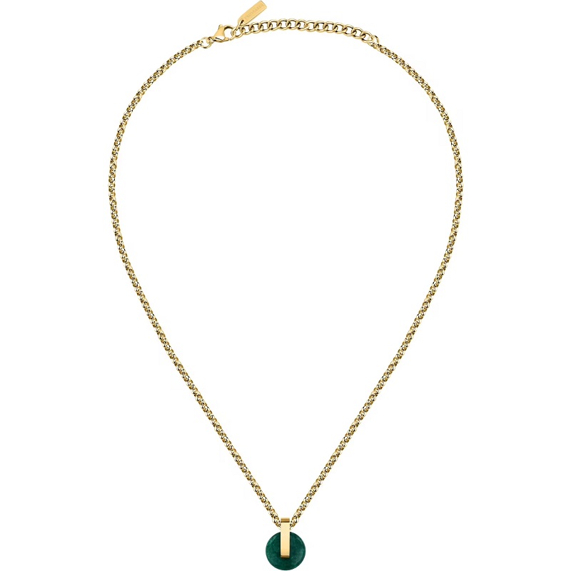 Genere: Donna - Lunghezza totale 40 cm - Colore: Oro Giallo - Stile: Fashion - Modello: Catenina con Ciondolo tondo a bottone - Materiale: Acciaio inox dorato, Agata Naturale Verde - Certificato di autenticità - Confezione: Originale Trussardi.