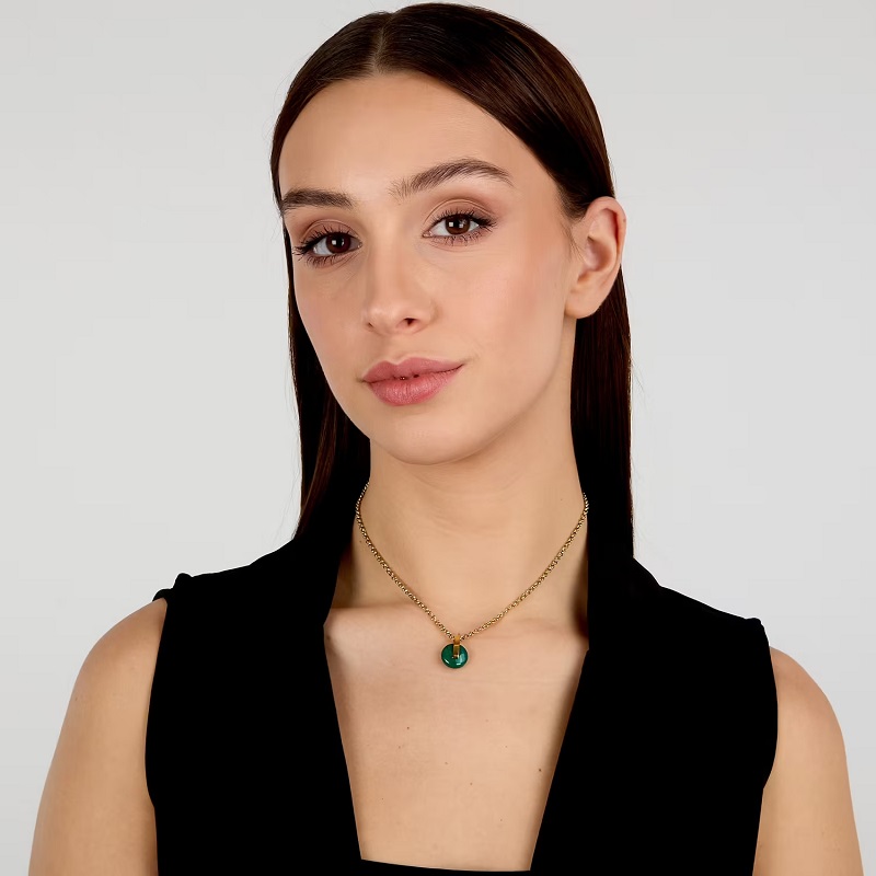 Genere: Donna - Lunghezza totale 40 cm - Colore: Oro Giallo - Stile: Fashion - Modello: Catenina con Ciondolo tondo a bottone - Materiale: Acciaio inox dorato, Agata Naturale Verde - Certificato di autenticità - Confezione: Originale Trussardi.