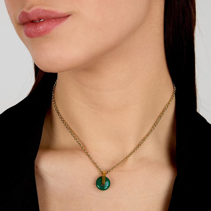 Genere: Donna - Lunghezza totale 40 cm - Colore: Oro Giallo - Stile: Fashion - Modello: Catenina con Ciondolo tondo a bottone - Materiale: Acciaio inox dorato, Agata Naturale Verde - Certificato di autenticità - Confezione: Originale Trussardi.