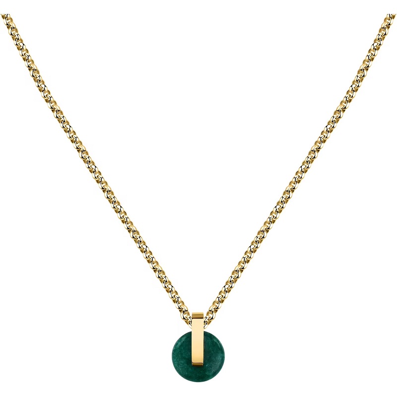Genere: Donna - Lunghezza totale 40 cm - Colore: Oro Giallo - Stile: Fashion - Modello: Catenina con Ciondolo tondo a bottone - Materiale: Acciaio inox dorato, Agata Naturale Verde - Certificato di autenticità - Confezione: Originale Trussardi.