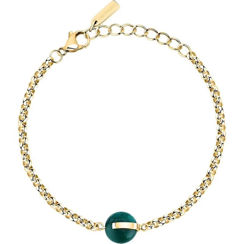 Genere: Donna - Lunghezza massima 19 cm, accorciabile - Colore: Oro giallo - Stile: Fashion - Modello: Catena a maglie, con boulle centrale (diametro 1 cm) a bottone, in Agata naturale verde - Materiale: Acciaio inox - Peso: 5,2 gr - Certificato di autenticità - Confezione: Originale Trussardi.