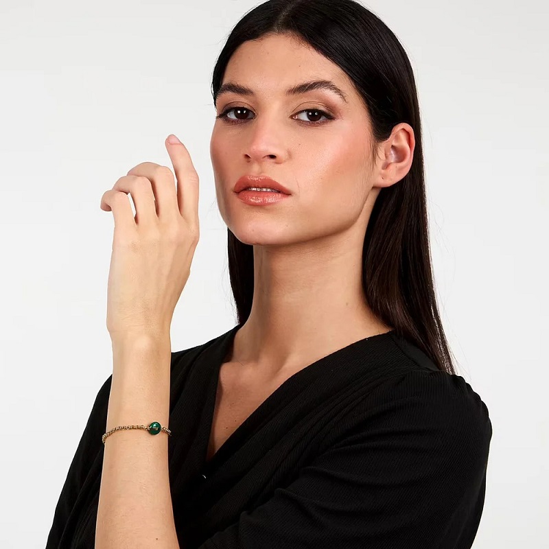 Genere: Donna - Lunghezza massima 19 cm, accorciabile - Colore: Oro giallo - Stile: Fashion - Modello: Catena a maglie, con boulle centrale (diametro 1 cm) a bottone, in Agata naturale verde - Materiale: Acciaio inox - Peso: 5,2 gr - Certificato di autenticità - Confezione: Originale Trussardi.