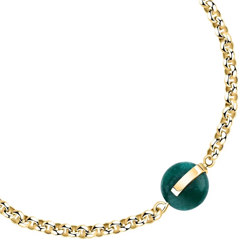 Genere: Donna - Lunghezza massima 19 cm, accorciabile - Colore: Oro giallo - Stile: Fashion - Modello: Catena a maglie, con boulle centrale (diametro 1 cm) a bottone, in Agata naturale verde - Materiale: Acciaio inox - Peso: 5,2 gr - Certificato di autenticità - Confezione: Originale Trussardi.