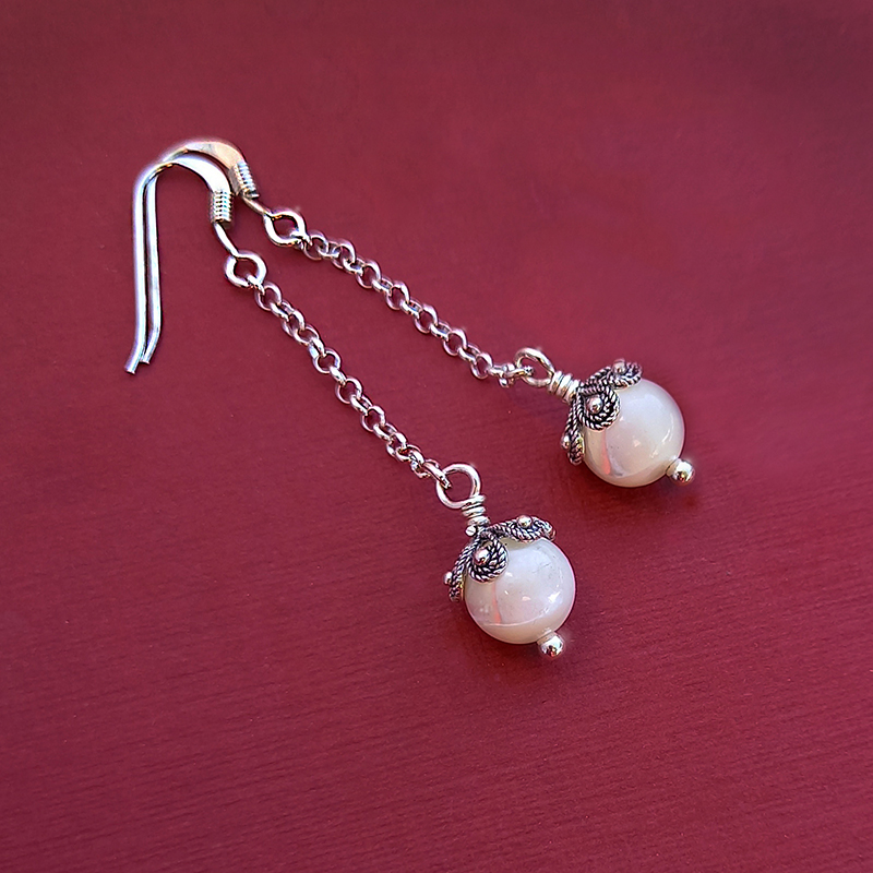 Orecchini pendenti in filigrana sarda e catena d’argento con pietra madreperla.