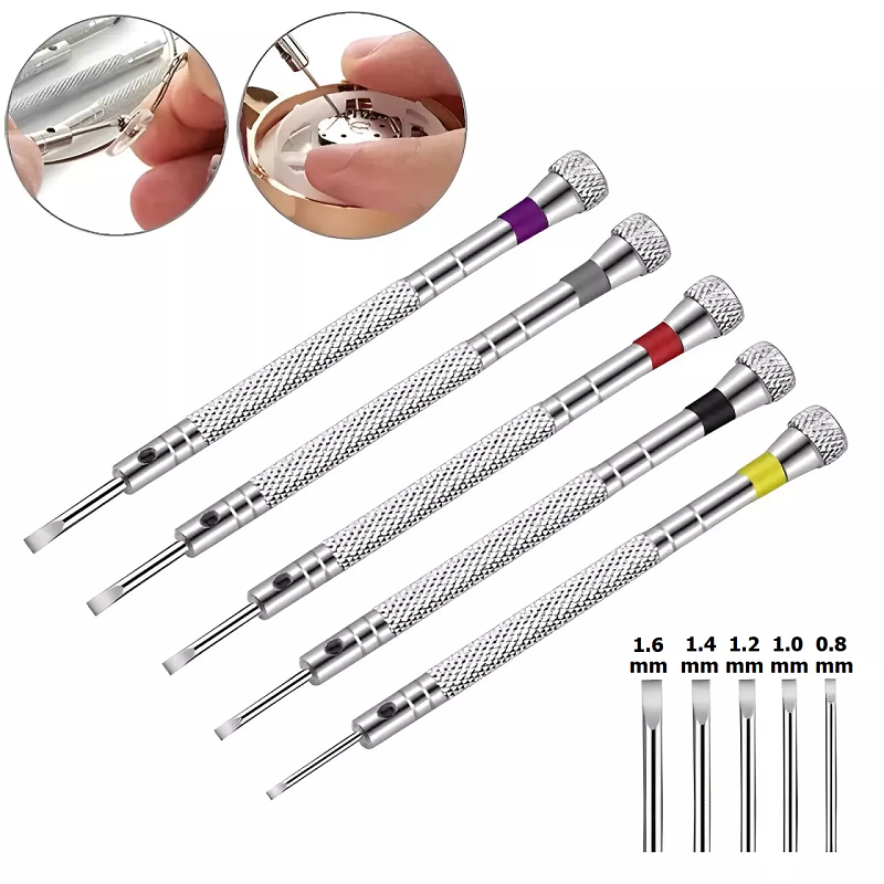 Misure tagli Cacciaviti del Kit /Set: 0,80 mm - 1,00 mm - 1,20 mm (misura indicata per l'accorciatura maglie Jubilee di Rolex) - 1,40 mm - 1,60 mm (misura indicata per l'accorciatura maglie Rolex e altri bracciali)a metallo / teflon) + kit cacciaviti a taglio piatto (no a stella) + kit punte.