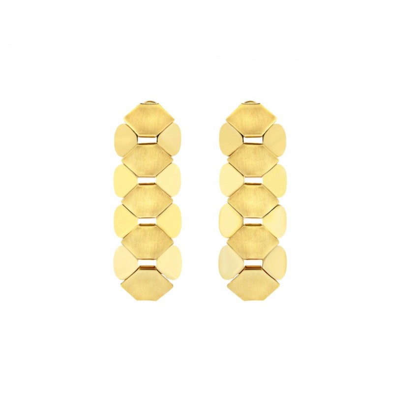 Gli orecchini Hexagonia presentano forme esagonali che aggiungono un tocco di eleganza moderna a qualsiasi look. La loro struttura verticale accentua la silhouette del viso. Realizzati in acciaio lucido color oro, sono comodi e leggeri per essere indossati tutta la giornata: perfetti per illuminare il volto nelle serate eleganti o per elevare un look casual da giorno.