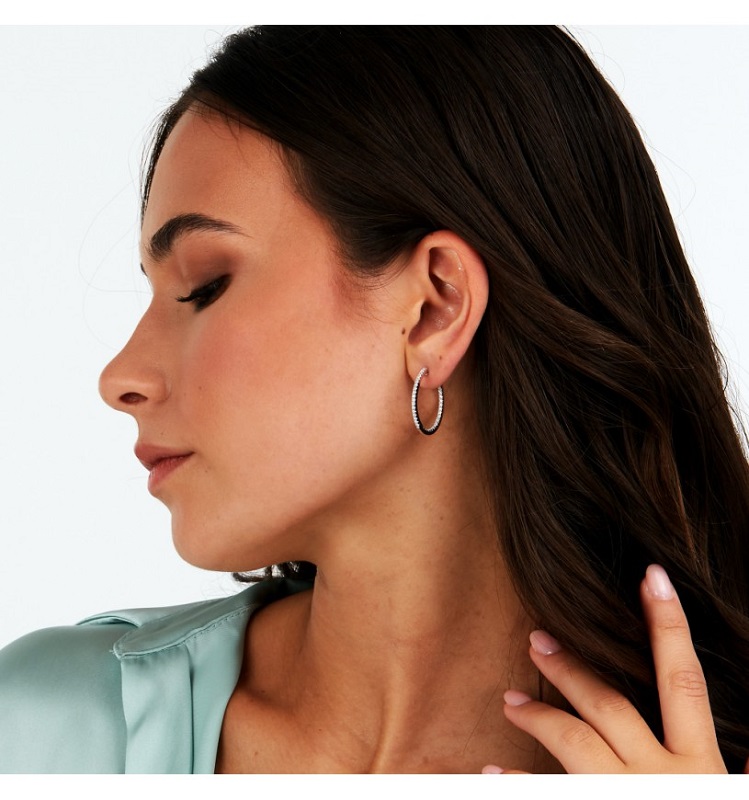 Orecchini a cerchio da donna realizzati in argento 925% rodiato con pave' di cristalli bianchi.