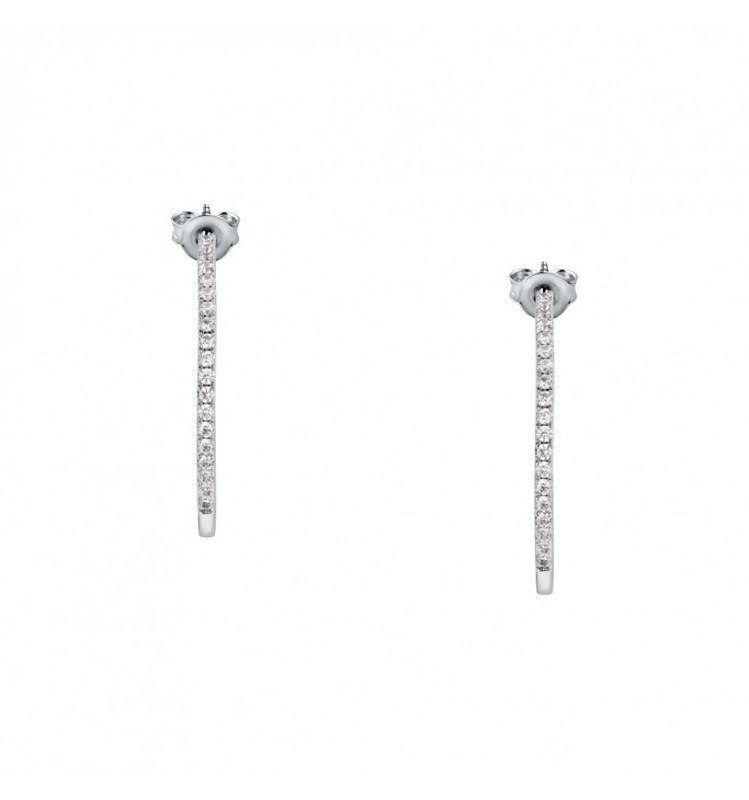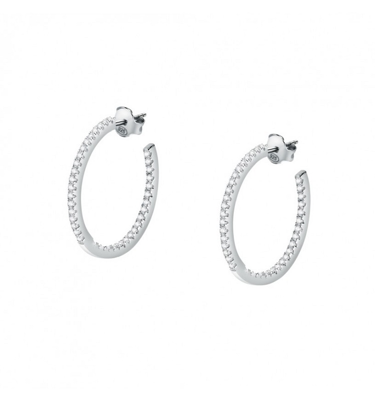 Orecchini a cerchio da donna realizzati in argento 925% rodiato con pave' di cristalli bianchi.