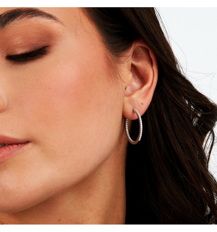 Orecchini a cerchio da donna realizzati in argento 925% rodiato con pave' di cristalli bianchi.