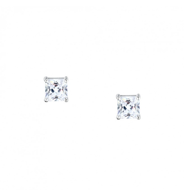 Orecchini a lobo da donna realizzati in argento 925% con finitura rodiata. Punto luce centrale zircone bianco, taglio square Chiusura con farfallina - Peso: 1.900g