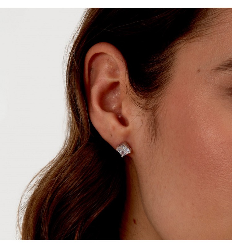Orecchini a lobo da donna realizzati in argento 925% con finitura rodiata. Punto luce centrale zircone bianco, taglio square Chiusura con farfallina - Peso: 1.900g