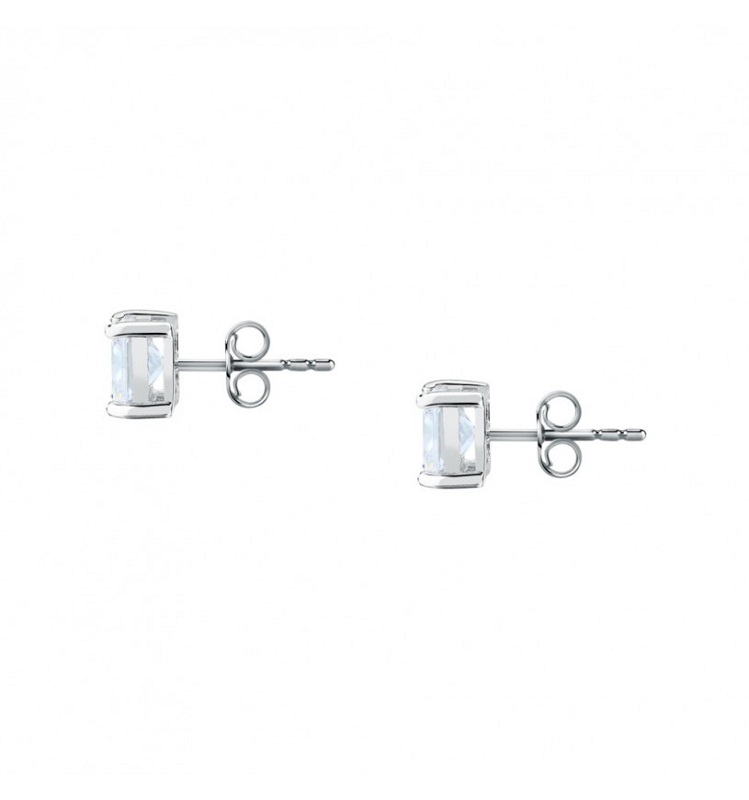 Orecchini a lobo da donna realizzati in argento 925% con finitura rodiata. Punto luce centrale zircone bianco, taglio square Chiusura con farfallina - Peso: 1.900g