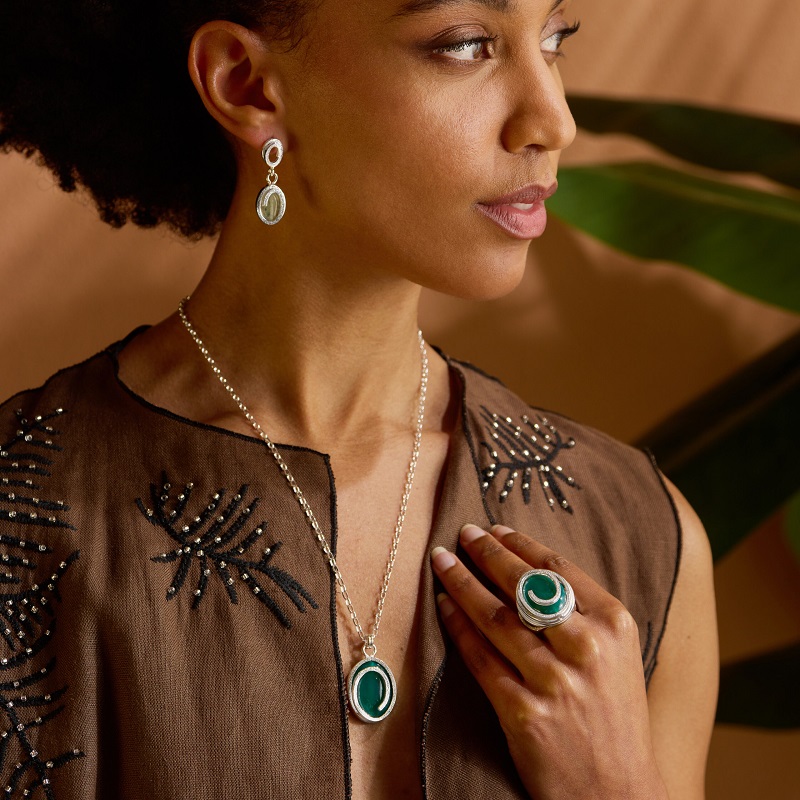 Rifugio di pace infinita: l’agata trova il suo argento che levigato e lucente, abbraccia l’agata verde come un miraggio che irrompe nel paesaggio arido, portando con sé la promessa di freschezza e serenità. Il deserto si trasforma in un giardino segreto, un angolo di pura armonia. Linea Oasi è un invito a scoprire l’essenza della natura selvaggia e l’eleganza senza tempo di terre calde, dove ogni dettaglio racconta la magia di un’oasi che vive nel cuore di chi la sa cercare.