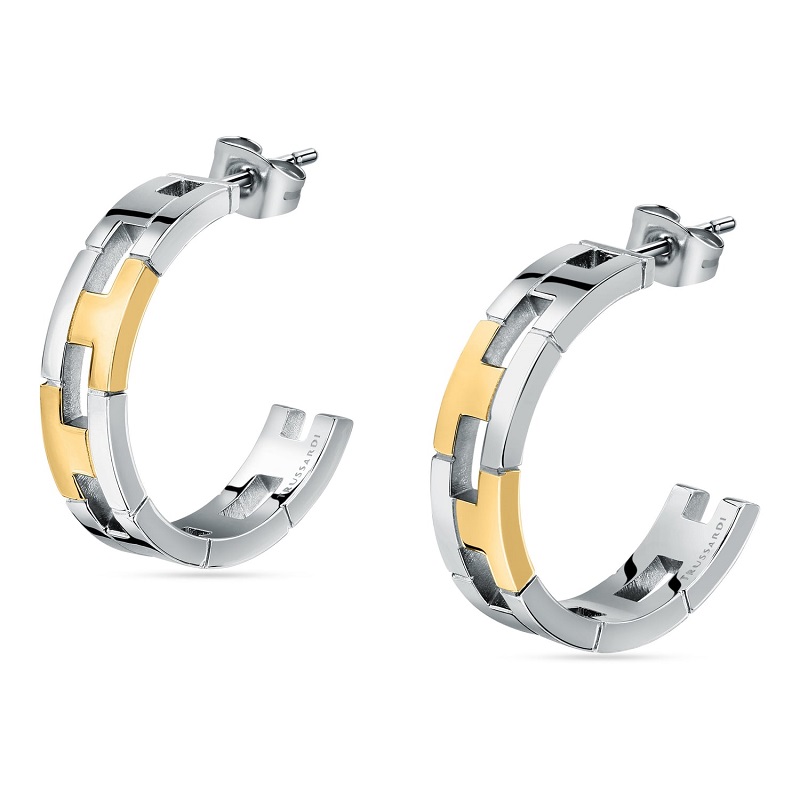 Genere: Donna - Colore: Silver e Oro Giallo - Stile: Fashion - Modello: A cerchio Ø 2,5 cm, con chiusura a vite e farfallina - Materiale: Acciaio inox dorato - Peso: 7 gr - Certificato di autenticità - Confezione: Originale Trussardi.
