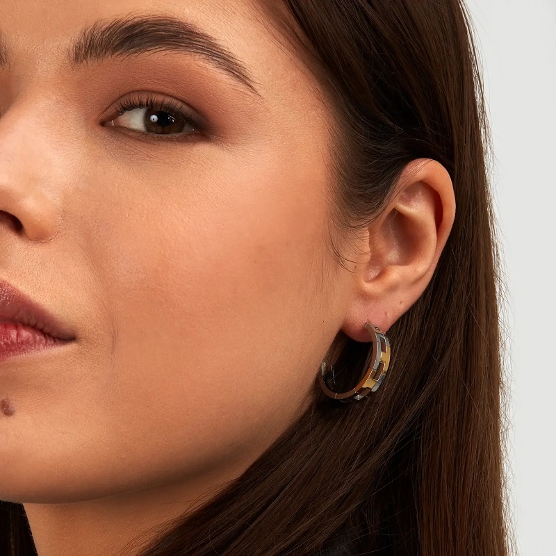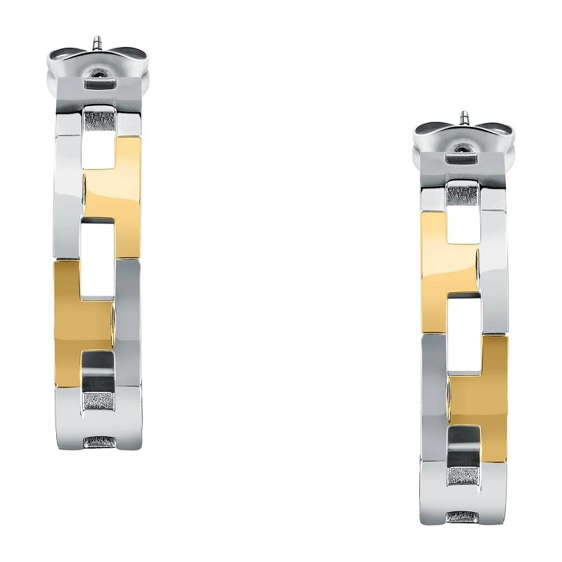 Genere: Donna - Colore: Silver e Oro Giallo - Stile: Fashion - Modello: A cerchio Ø 2,5 cm, con chiusura a vite e farfallina - Materiale: Acciaio inox dorato - Peso: 7 gr - Certificato di autenticità - Confezione: Originale Trussardi.