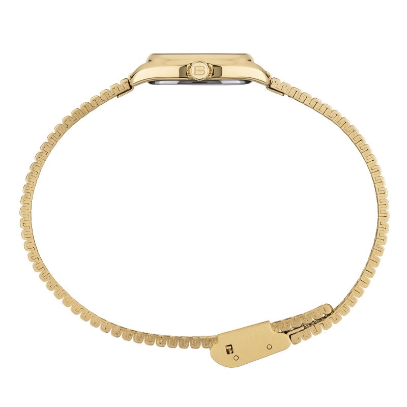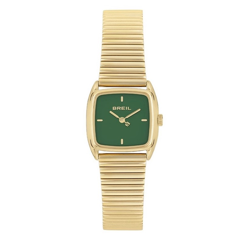 L'orologio da donna Stylize prende ispirazione dai tratti tipici dell'Art Decò, caratterizzata da forme geometriche e linee ripetute. L'orologio solo tempo in acciaio lucido color oro ha la cassa di forma che si adatta anche ai polsi più piccoli, abbinata a un bracciale a fitte maglie zigrinate. Il quadrante minimal e pulito è verde brillante, un colore che mostra la sua massima eleganza se abbinato al color oro.