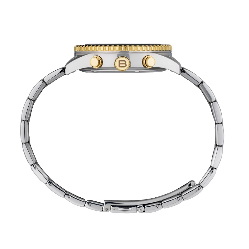 Il cronografo da uomo Overhand prende ispirazione dall'ambiente marino. Questa variante presenta un nuovo aspetto più fashion: cassa e bracciale in acciaio sono accostati a un quadrante nero, illuminato da indici bianchi a contrasto e dettagli color oro, abbinato alla lunetta in acciaio color oro. La finitura bilux lucida e satinata del bracciale, così come la sua maglia centrale dorata, arricchiscono questo orologio di stile.