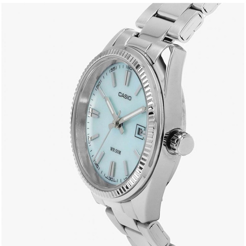 Genere Donna - Movimento giapponese (Solo tempo - Data) - Cassa in Acciaio (diametro 30 mm / spessore 8 mm) - Fondo in acciaio inox, a pressione - Corona a pressione - Quadrante in Madreperla Azzurra, con indici in metallo e lancette luminose al buio - Vetro minerale - Bracciale in acciaio inox - Resistente all'acqua 5 atm