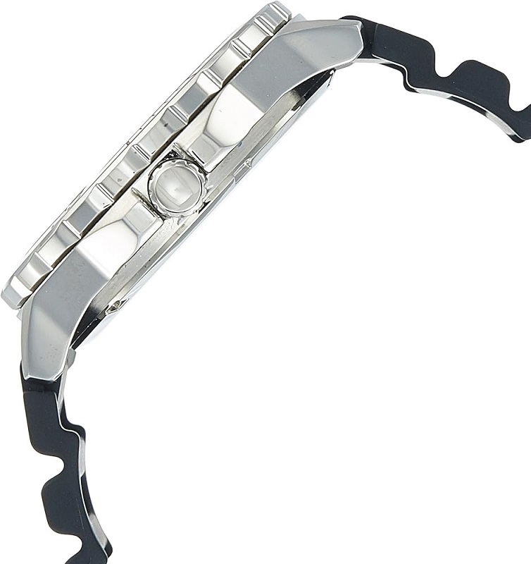 Genere Uomo - Movimento giapponese (Solo Tempo, con Giorno / Data) - Cassa in acciaio anallergico lucido specchiato, di forma rotoda (diametro 44 mm / spessore 8 mm) - Lunetta in metallo rosé, con scala 60 secondi - Quadrante argento opaco - Fondo in acciaio inox, a vite - Corona in acciaio - Indici e Lancette luminose al buio - Vetro minerale - Datario - Cinturino nero gomma, con antisudore e fibbia in acciaio inox - Resistente all'acqua 5 atm.