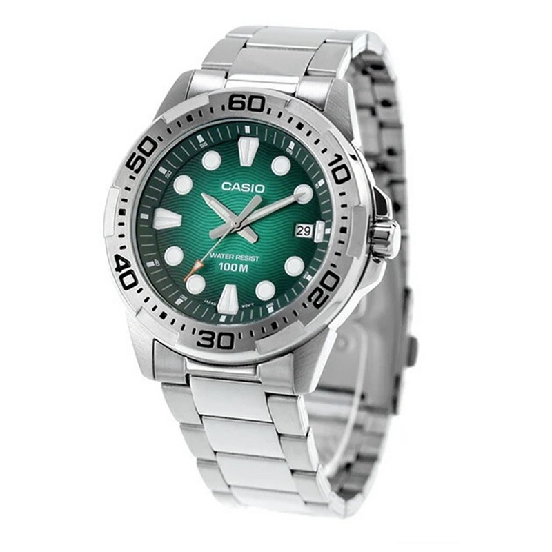 Modello: CASIO MTD-140D-3A Marine Sports Orologio Uomo Diver Style - Movimento: Quarzo - Materiale Cassa: Acciaio - Bracciale: Acciaio - Quadrante: Analogico, color verde acqua (a motivo onde), con lancette luminose al buio e indici ben visibili (non luminosi al buio) - Funzione: Tempo / Data - Dimensioni Cassa: Diametro 43 mm  / Spessore 9 mm - Fondo: In acciaio, a vite - Water Resistant: 10 atm