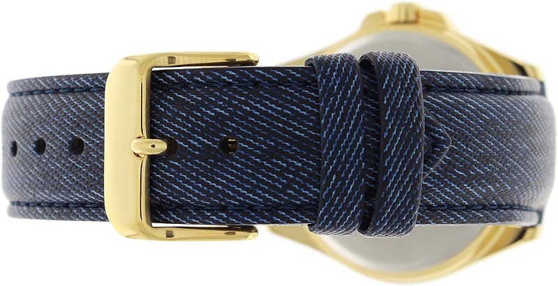 Genere Uomo - Movimento giapponese (Solo Tempo, con Giorno/Data) - Cassa in acciaio color oro specchiato, di forma rotoda (diametro 38 mm / spessore 9 mm) - Quadrante blu metallizzato, con indici in metallo dorato - Fondo in acciaio inox, a pressione - Corona in acciaio color oro - Lancette luminose al buio - Vetro minerale - Datario - Cinturino blu in ecopelle, tipo jeens e fibbia in acciaio inox - Resistente all'acqua 5 atm.