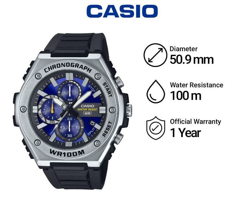Movimento al quarzo giapponese: Cronometro da 1/10 di secondo / Data - Vetro in resina - Quadrante blu metallizzato - Lancette luminose - Fondello a 4 viti - Cinturino in gomma/resina, con fibbia in plastica - Resistenza all'acqua 10 atm - Cassa in resina, con parte superiore in alluminio: Dimensioni della cassa (L × P × A): 52,3 × 50,9 × 14,3 mm / Diametro della cassa: 50,90 mm / Spessore della cassa: 14,30 mm