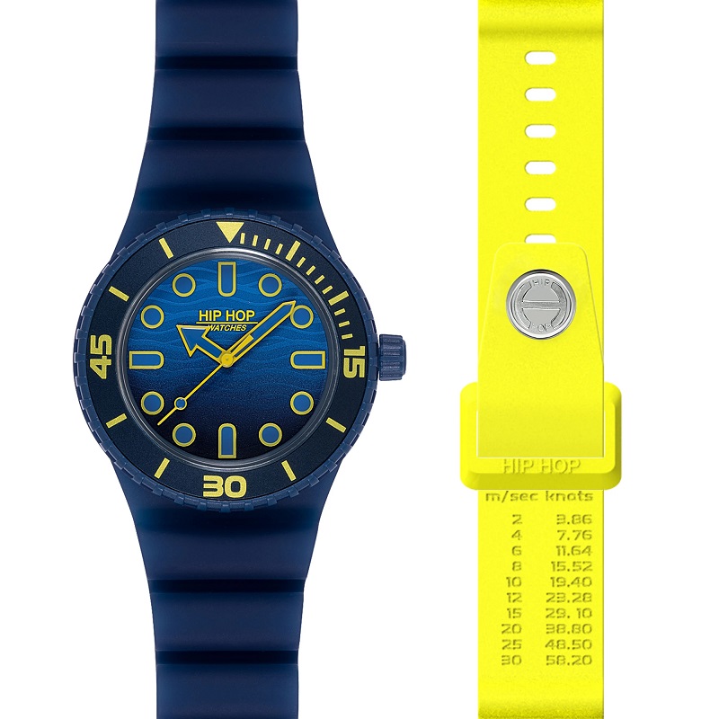 L’orologio Hip Hop Master è un mix perfetto di stile e praticità, adatto ad affrontare qualsiasi sfida quotidiana con energia e precisione. Il quadrante, dal pattern sfumato e ondulato sui toni del blu, è illuminato da indici e sfere con luminous giallo lime a contrasto. La lunetta girevole unidirezionale è caratterizzata da una sfumatura sui toni del blu, per un accostamento di carattere e stile. Il morbido cinturino in silicone semitrasparente blu ha la chiusura .DOT e ha impresso un dettaglio speciale: la Wind Speed, scala di conversione da metri al secondo a nodi per indicare la velocità del vento. L’orologio è venduto con un secondo cinturino intercambiabile in silicone color lime yellow per essere sempre intonati con il mood della giornata.