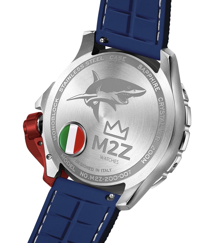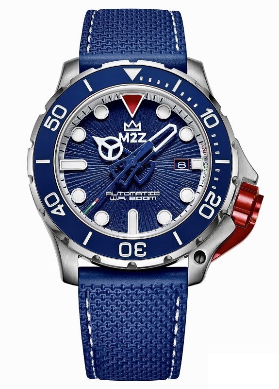 Descrizione: Diametro cassa: 46.00 mm - Spessore cassa: 17.00 mm - Materiale cassa: Monoblocco acciaio Inox 316L - Vetro: Zaffiro - Cinturino: Polimero anallergico nero - FKM - Water resistant: 20 atm - Corona: Corona a vite, con doppia guarnizione, con proteggi corona estraibile in alluminio anodizzato rosso - Movimento: Movimento automatico 3HD Seiko NH35, con riserva di carica 41 ore - Lunetta: Lunetta girevole unidirezionale in senso anti orario, con inserto in silicone blu.