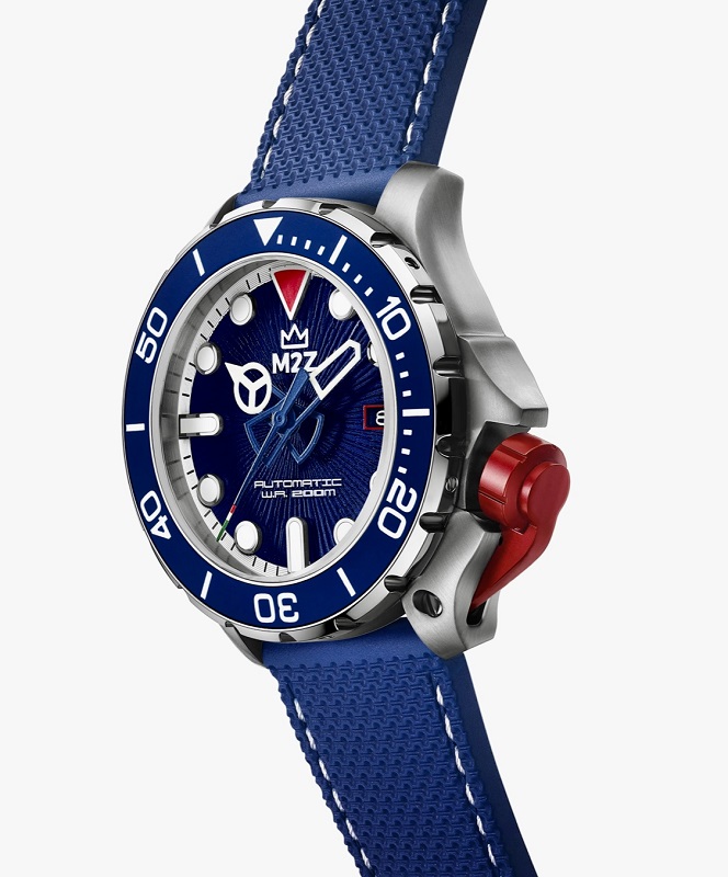 M2Z DIVER 200 è l'orologio italiano realizzato in un unico blocco di acciaio 316L che lo rende resistente fino ad una profondità di 200 metri. Il cinturino, dotato di meccanismo a sgancio rapido è realizzato in polimero anallergico (FKM) utilizzato nell'industria aerospaziale per la sua elevata resistenza all'attacco di agenti chimici, ai raggi ultravioletti e agli ossidanti. Il quadrante con indici applicati e sfere luminescenti è decorato da una texture a ondine in rilievo. Un altro elemento interessante è il proteggi corona in alluminio anodizzato che salvaguarda la chiusura a vite con doppia guarnizione da qualsiasi urto o collisione. Il cuore pulsante di questo segnatempo dalle dimensioni generose (46 mm) è un movimento meccanico automatico NH35 di casa Seiko.